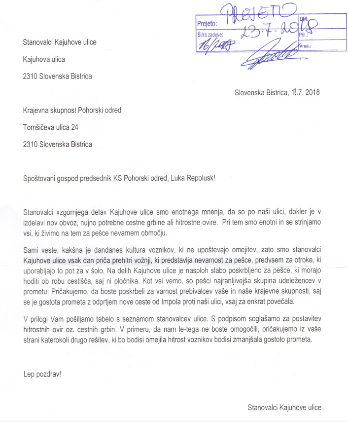 Na pobudo krajanov – prebivalcev Ul. Slave Klavore, da ulica ni ustrezno obvestilno prometno urejena, se je Svet KS Pohorski odred odzval in z dopisom o upravičenosti seznanil Oddelek za okolje in prostor.