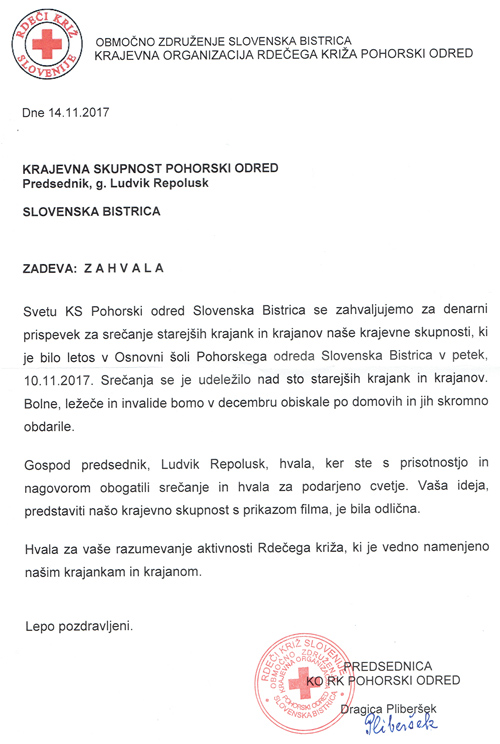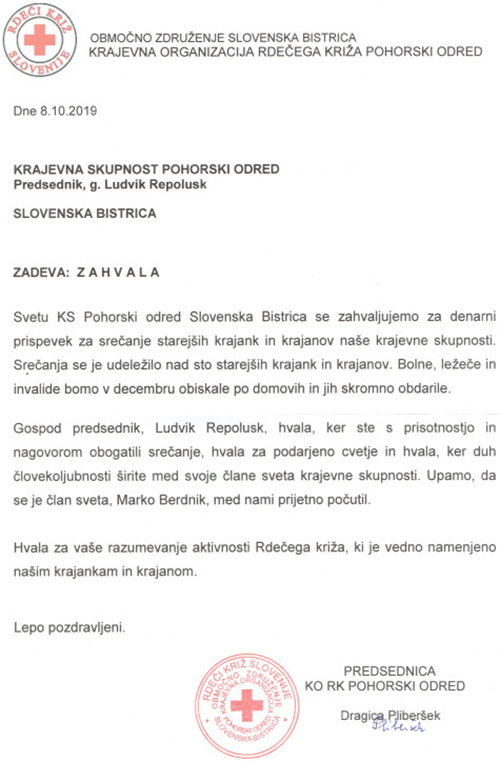 Prejeli smo zahvalo s strani Krajevne organizacije Rdečega križa Pohorski odred Slovenska Bistrica.