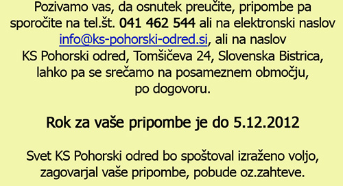 Zato vas pozivamo, da nam vaše mnenje, predloge, videnje stanja, sporočite na e-mail: info@ks-pohorski-odred.si do vključno 16. 1. 2022.